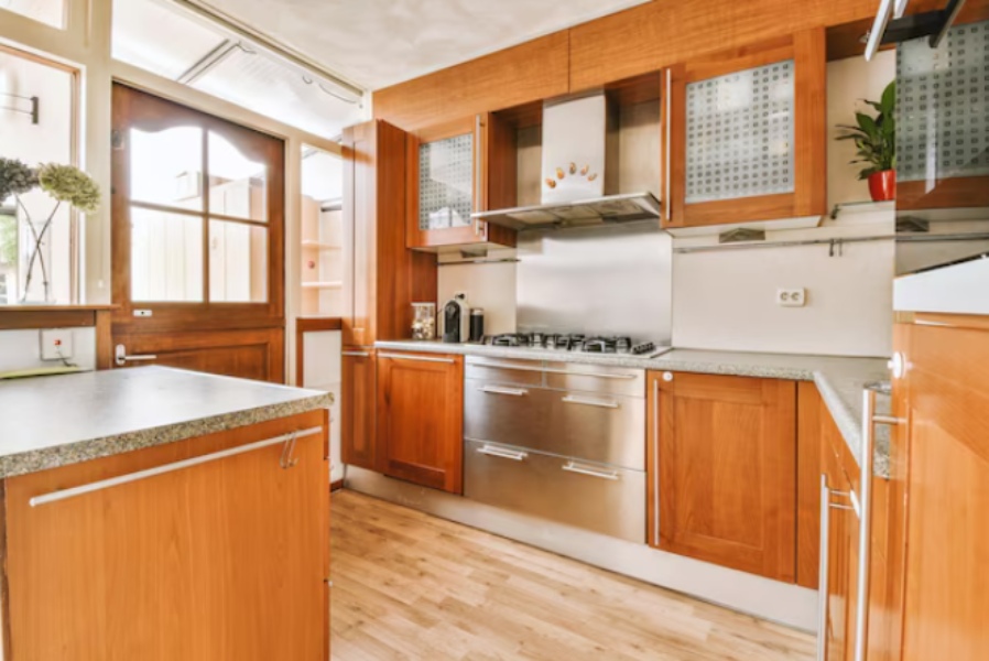 A wooden U shape modular kitchen in Sathyamangalam is ideal for homes that have sufficient kitchen space and require maximum storage and workspace. This layout allows easy movement between cooking, preparation, and cleaning areas, making it highly suitable for busy households.